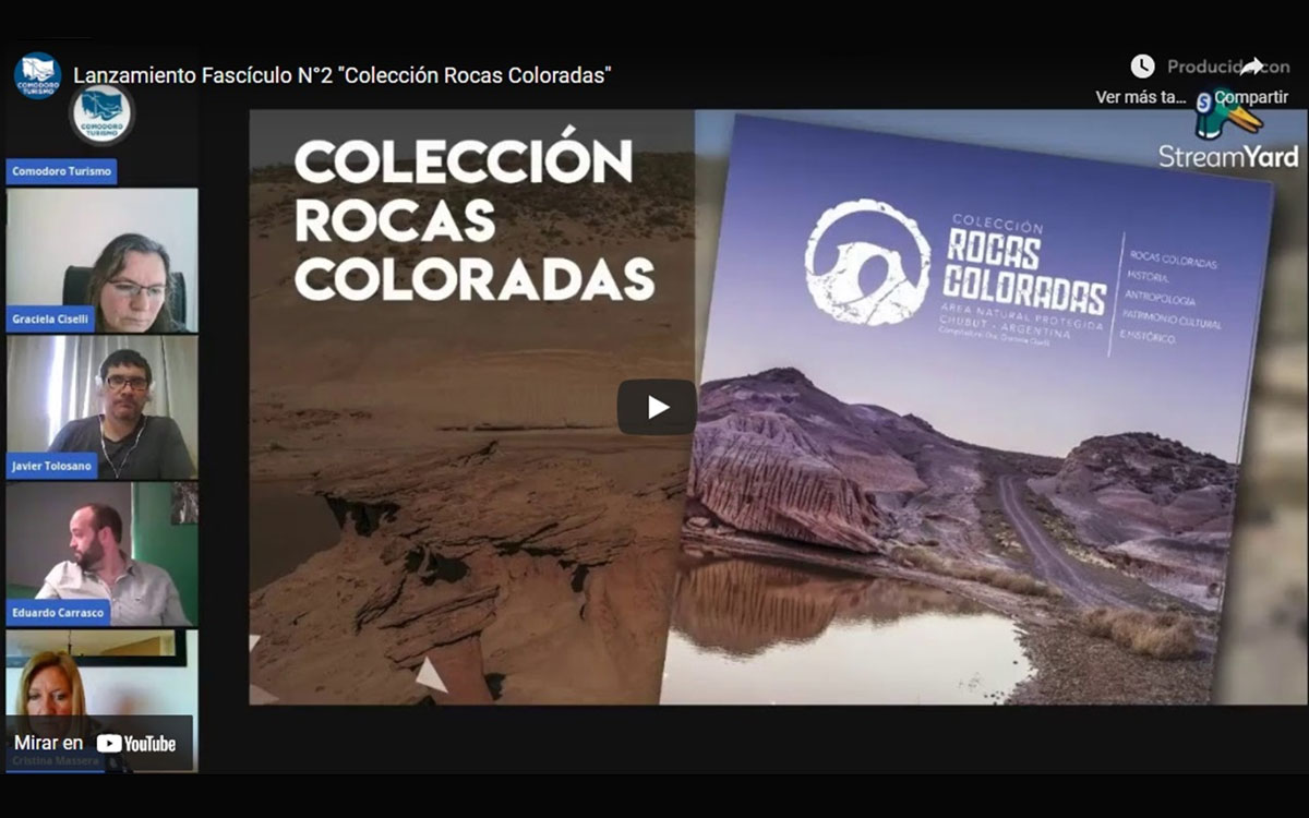 Lanzamiento Fascículo N°2 "Colección Rocas Coloradas", proyecto en colaboración entre la Universidad Nacional de la Patagonia San Juan Bosco y Comodoro Turismo. Participan Javier Tolosano, Cristina Massera y Graciela Ciselli (UNPSJB). Acompaña Eduardo Carrasco, vicepresidente de Comodoro Turismo.